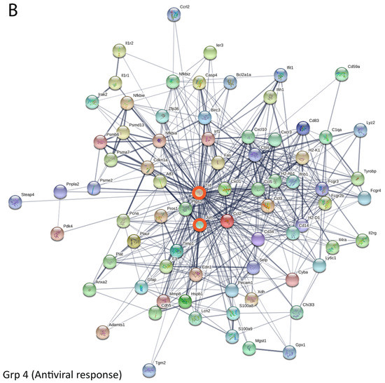 Figure 7. Network analysis of the up-regulated gene in Ifnar−/− mice reveals a TNF to be a crucial regulator for antiviral immune response. The figure depicts a modular network formed using the upregulated genes. (A) protein-to-protein interaction (PPI) network was developed using the STRING (Search Tool for the Retrieval of Interacting Gene) database. The interaction was divided into four groups using the K-means clustering tool from the STRING database. Each group defines the essential unique function: group 1 includes metabolic pathway genes, group 2 comprises olfactory related gene, group 3 represents the protein translation gene, and group 4 contains antiviral response-related genes. (B) Later, group 4 genes representing the antiviral response were used for the interactome generation by using the STRING database. The network shows the maximum connectivity patterns where Jun was found to have the highest number of connective nodes, followed by that of TNF-α.