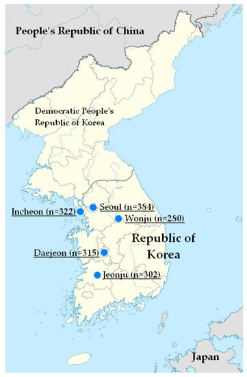 This multicenter and prospective study was conducted in Korea between March 2012 and August 2012. The 1603 specimens were collected from clinically healthy adolescents and adults above 15 years old in five geographically distant hospitals (The Catholic University of Korea, Seoul St. Mary’s Hospital, Wonju Severance Christian Hospital, Inha University Hospital, Jeonbuk National University Hospital, and Chungnam National University Hospital) in Korea—Seoul as inland capital, Wonju as mountainous terrain, Incheon as a port city, Jeonju as plain ground, and Daejeon as middle inland (Figure 1). Blood samples were collected from each of more than 100 specimens at every age from the age of 15 to 19 years and at every 5 ages of interval from the age group of 20 to 69 years; 87 specimens were obtained over 70 years of age. The subjects with impaired immunologic function, malignancy, blood derivative use, immunosuppressant use, or other immune-modifying drug use were excluded. All the samples were obtained after written informed consent was obtained from each participant. The study protocol was approved by the Institutional Review Board of Inha University Hospital (IUH-IRB-12-09-088), as well as an independent review board at each study site.