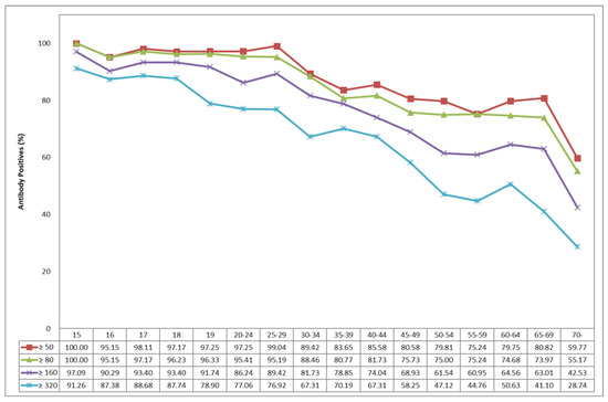 The results of this study showed that the seropositive rate was more than 95% in 15–29 year age group and gradually began to decrease from the ages above 30 years to 75.24% in the 55–59 age group, followed by 80.82% in the 65–69 age group, and 59% in the 70 or older age group. The seropositivity and titers for NTAbs to JEV revealed appropriate levels for all age groups above 15 years old in Korea.