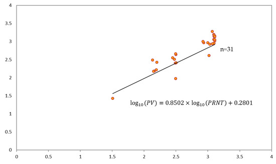 Estimating the regression coefficients using 100,000 bootstrapping for 40 samples resulted in a higher mean value of the determinant, with 24 samples at 0.6058. Calculating the confidence intervals of 95% of the estimated coefficients, log10(PRNT) included 1 with 0.6267 to 1.0737 and the intercept included 0 with −0.3531 to 0.9133. According to the simple regression model analysis of this study, the r value was 0.778 for R2 = 0.6058, and the regression equation (Figure 3), excluding nine samples that exceeded the threshold of external standardized residuals for regression lines using bootstrapping between NTAb titers using the PRNT and PV assays, is shown below.