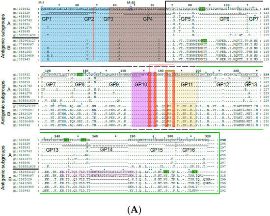 - Johnson, P.R.; Spriggs, M.K.; Olmsted, R.A.; Collins, P.L. The G glycoprotein of human respiratory syncytial viruses of subgroups A and B: Extensive sequence divergence between antigenically related proteins. Proc. Natl. Acad. Sci. USA 1987, 84, 5625–5629. [Google Scholar] [CrossRef]