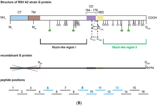 - Simard, C.; Nadon, F.; Séguin, C.; Thien, N.N.; Binz, H.; Basso, J.; Laliberté, J.-F.; Trudel, M. Subgroup specific protection of mice from respiratory syncytial virus infection with peptides encompassing the amino acid region 174–187 from the G glycoprotein: The role of cysteinyl residues in protection. Vaccine 1997, 15, 423–432. [Google Scholar] [CrossRef]