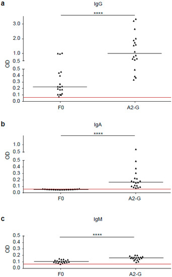3.3. RSV G-Specific IgG Responses Dominate over IgM and IgA and Are Significantly Stronger than F0-Specific Responses