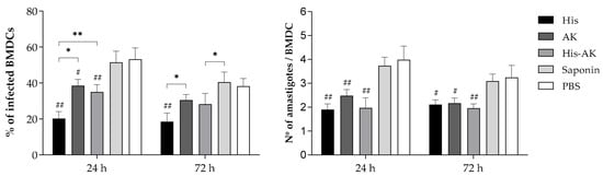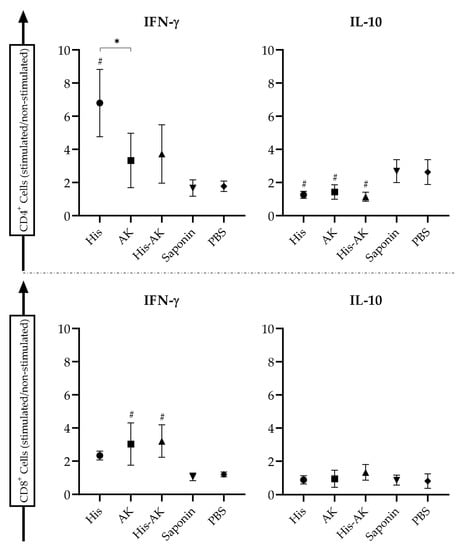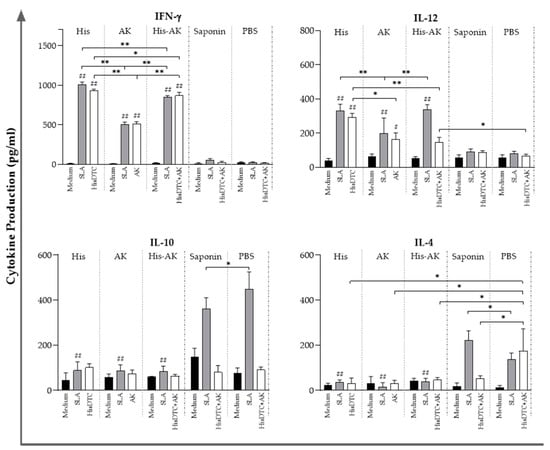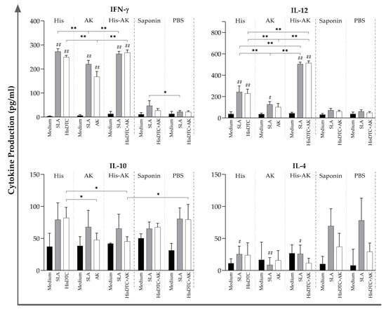 With the aim of analyzing the cytokine levels induced by immunization before in vivo challenge, naïve BMDCs were seeded (5 × 105 cells/mL) into 24-well plates and pulsed overnight with 25 µg/mL SLA for all the groups. In parallel, 15 µg/mL HisDTC for the His group, 15 µg/mL AK for the AK group, and 7.5 µg/mL HisDTC and 7.5 µg/mL AK for His-AK and both control groups were added for restimulation. Subsequently, BMDCs were cultured together with splenocytes isolated from immunized and sacrificed mice (n = 4 per group) at a 1:5 ratio (BMDCs:splenocytes) as previously described []. After 4 days of coculture, supernatants were collected and the levels of IFN-γ, IL-12 (p40), IL-10, and IL-4 were determined by using commercial ELISA kits following the manufacturer’s instructions as follows: for IFN-γ, the Eli-pair kit (Diaclone, Besanços, France); for IL-12 (p40) and IL-10, the BD OptEIA kit (Bioscience, San Diego, CA, USA); for IL-4, the Duoset ELISA kit (Development System R&D, Abingdon, UK).