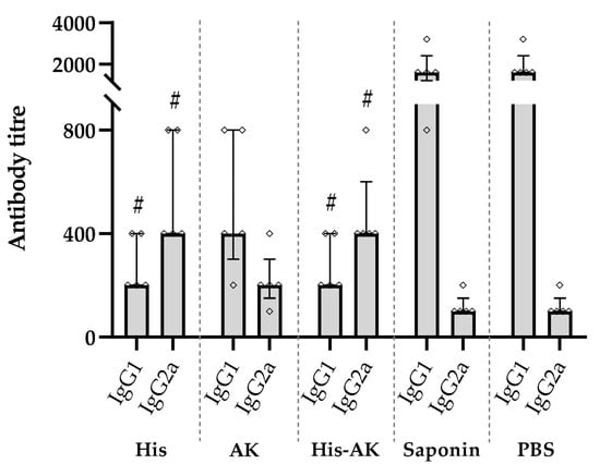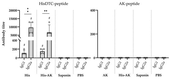 Specific humoral response generated after vaccination. The reciprocal endpoint titer of IgG1 and IgG2a antibodies against HisDTC and AK peptides of each animal was determined (romboids). Data are presented as the median and the interquartile range. Hashes (#) indicate significant differences (p < 0.05) between immunized and control (Saponin and PBS) groups. Asterisks indicate significant differences (**, p < 0.001).