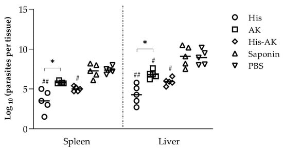 To evaluate whether the immune response elicited by vaccination was maintained during infection and conferred protection, the peptide-specific response was assessed in both vaccinated and control groups infected with L. infantum 6 weeks after challenge. His and His-AK groups presented a significant lower parasite burden in both the liver and spleen compared to the Saponin and PBS groups, whereas the AK group only presented a significantly lower amount of parasite in the liver (Figure 4). Moreover, and in keeping with the results found in the preinfection studies in both targeted organs, His-immunized animals presented a significantly (p < 0.05) lower parasite burden than the AK group.