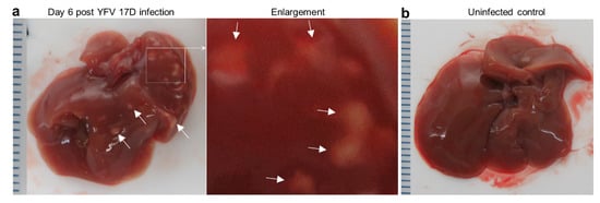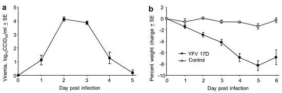 - Meier, K.C.; Gardner, C.L.; Khoretonenko, M.V.; Klimstra, W.B.; Ryman, K.D. A mouse model for studying viscerotropic disease caused by yellow fever virus infection. PLoS Pathog. 2009, 5, e1000614. [Google Scholar] [CrossRef] [PubMed]