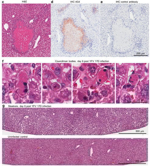 The necrotic lesions were clearly evident by H & E staining of liver sections (Figure 2c). The periphery of such lesions also stained for flaviviral antigen by immunohistochemistry (IHC), indicating viral infection of hepatocytes (Figure 2d), an observation consistent with studies in YF patients [37,38]. H & E staining also showed the presence of Councilman bodies (range of 2–5 per liver section) (Figure 2f), a histological feature originally deemed pathognomonic for YFV infection [38,39]. Some YFV 17D-infected mice also showed clear signs of steatosis (abnormal retention of lipid within hepatocytes) (Figure 2g, small white inclusions), a feature well described in YF patients [37].