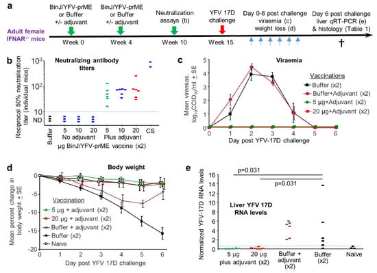 Wild-type YFV is classified as a biosafety level 3 (BSL3) organism, whereas culture and growth of the YFV 17D vaccine strain is classified as a BSL2 activity. Mouse models have been developed using YFV 17D including (i) infection of AG129 mice resulting in neurotropic disease [26] and (ii) infection of young (3–4 week old) IFNAR-/- mice showing viscerotropic and neurotropic disease [27], although Meier et al., reported no pathology in 3–4 week old A129 mice infected with YFV 17D-204 [28]. Herein we describe an adult IFNAR-/- mouse model of YFV 17D-204 (hereafter referred to as YFV 17D) infection and disease, which is suitable for pre-clinical evaluation of YFV vaccines. The model shows viraemia, weight loss and liver pathology, and was used to evaluate protection mediated by an adjuvanted BinJ/YFV-prME vaccine.