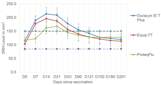 The mean SRH values with standard deviation bars for the three vaccine groups, those vaccinated with a whole-inactivated vaccine (Duvaxyn IE-T Plus), an ISCOM subunit vaccine (EquipFT) and a recombinant canarypox vaccine (ProteqFlu-Te), at each sampling point, i.e., the day of vaccination (D0) and days 7, 14, 21, 60, 90, 121, 150, 180 and 201 post vaccination. The black dashed line with blue circles indicates 150 mm2, the threshold level of SRH antibodies associated with virological protection. The purple dashed line indicates 85 mm2, the threshold level of SRH antibodies associated with clinical protection.