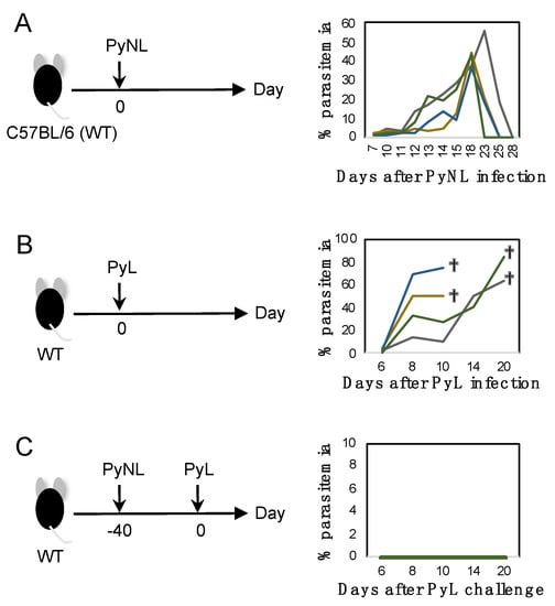 At the beginning of the experiment, we confirmed the course of infection of blood-stage PyNL in C57BL/6 (WT) mice (Figure 1A left). WT mice were infected with PyNL (5000 pRBC mixed stage of blood-stage parasites) by i.p. injection. Usually, PyNL infection was non-lethal and parasitemia increased to a peak at day 15–23 post-infection of roughly 40% parasitemia. Parasites were then eliminated by the host immune system within 1 month (Figure 1A). Blood-stage parasites parasitize RBC and when merozoites exit infected RBC, the host cells are destroyed. Thus, PyNL induced anemia, as we reported previously []. PyL infection (5000 pRBC mixed stage of blood-stage parasites) by i.p. injection was lethal and parasitemia increased to over 50% (Figure 1B). When we challenged mice that recovered from PyNL infection with the cross-strain PyL, which is a lethal strain in naïve WT mice, PyNL-recovered mice showed complete protection against PyL; we did not see emergence of any parasites (Figure 1C). Thus, blood-stage PyNL can be used as a cross-strain protective whole organism vaccine (Figure 1C, Table 1).