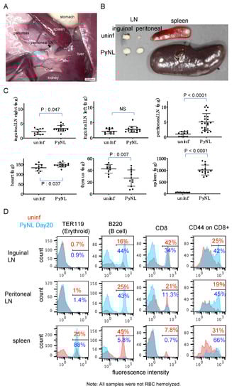 Spleen weight was dramatically increased, about 50-fold and its color turned into dark red or brown, by infection. The peritoneal LN in PyNL-infected mice was approximately five-fold bigger than in uninfected mice. Usually, the peritoneal LN is so small that sometimes it cannot be found. Thus indeed, the increase might be bigger than five-fold (Figure 2B,C). Heart and the right side of the inguinal LN were also enlarged significantly by infection, but to a lesser extent than the spleen or peritoneal LN. Conversely, the thymus was shrunken (Figure 2C).