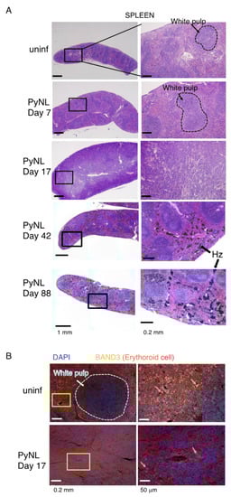 We further confirmed the architecture of the spleen by histology (Figure 3). We could clearly distinguish the white pulp and red pulp in uninfected mice based on H&E staining, while this structure was gradually re-constituted by PyNL infection. At day 17, around the time of peak parasitemia, white pulp and red pulp were hardly distinguishable. In other words, the red pulp region was expanded to accommodate massive erythrocyte production, which was consistent with the flow cytometry data (Figure 2C left). Again, we assessed the immunohistostaining with BAND3 [], which is a marker for erythroid cells (Figure 3B). Consistent with the H&E staining, the white pulp and red pulp were distinguishable in uninfected spleens, but on day 17, BAND3 positive cells were detected throughout the spleen. Additionally, we observed BAND3 positive, DAPI positive nucleated erythroblasts. This result was consistent with our previous finding of expansion of erythroblasts in PyNL-infected mouse spleen or bone marrow [].