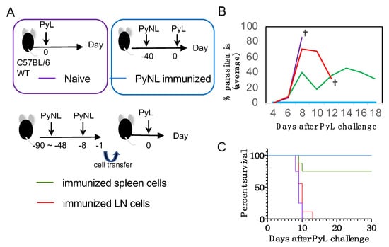 Immunized spleen cells confer protection but immunized peritoneal LN cells did not. (A) Experiment protocol. Four groups were challenged with lethal strain PyL at day 0 of the experiment: naïve C57BL/6 mice (upper left: purple line); PyNL immunized mice on day −40 (upper right: blue line); PyNL primed at day −90 to −48, boosted at day −8 then immunized spleen cells (RBC lysed; 4 × 106 cells: green line, 75% of recipient mice controlled the parasitemia) or immunized peritoneal LN cells (4 × 106 cells: red line) were transferred to recipient mice on day −1. (B) Average parasitemia and (C) survival curve (N = 8 in each group from two pooled independent experiments). Dagger indicates death.