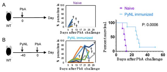 Limited cross-species protection against Plasmodium berghei ANKA (PbA) challenge following PyNL infection. Left panels show experiment protocol. Each group was challenged with blood-stage PbA on day 0. Center panels show parasitemia of each mouse. Each line indicates one mouse. Right panels show survival curves (N = 5–7). Two groups were compared. All data were pooled from two independent experiments. (A) Naïve mice (N = 5). (B) blood-stage PyNL immunized mice (N = 7). One mouse attained a maximum of 1.7% parasitemia at day 14 after PbA infection and cleared the parasite at day 20, while the remaining six animals succumbed to infection. Dagger indicates death.
