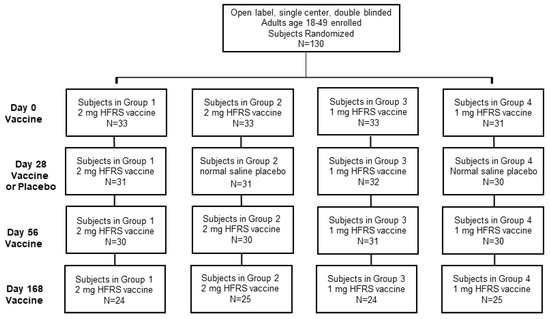 An objective of this study was to determine if reducing the initial series of vaccinations from three (days 0, 28 and 56) to two (days 0 and 56) would result in lower seropositivity or GMT. There was a significant (p < 0.05) reduction in the day 56 seropositivity rates and GMT when the day 28 vaccination was excluded; however, significant differences were not observed at any subsequent time points. Nevertheless, there was a trend of lower seropositivity and GMT for the two groups (cohorts 2 and 4) that did not receive the day 28 vaccination. This was the case for both the anti-PUUV and anti-HTNV responses. We concluded that it would be possible to reduce the initial series of vaccinations from three to two; however, the level of antibodies would be lower, especially during the second and third month after the initial vaccination series. For travelers, where there might be a need to elicit a more rapid immune response before traveling to an endemic area, including the Day 28 vaccination would be beneficial (e.g., cohort 1 or cohort 3).