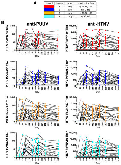 Pseudovirion neutralization assays (PsVNA)50 titers. Puumala virus (PUUV) and Hantaan virus (HTNV) PsVNA50 titers for each subject at each timepoint grouped by cohort. Subjects were randomized and vaccinated with the indicated amount of DNA (either 2 mg or 1 mg) on the indicated day (0, 28, 56, 168 or 0, 56 and 168). (A) Legend. (B) PUUV and HTNV PsVNA50 titers. Note that the Y-axis for PUUV and HTNV graphs are different. The limit of quantitation was a PsVNA50 titer of 20 (grey shaded area). Dashed line indicates specimens that were not included in the efficacy evaluable population.