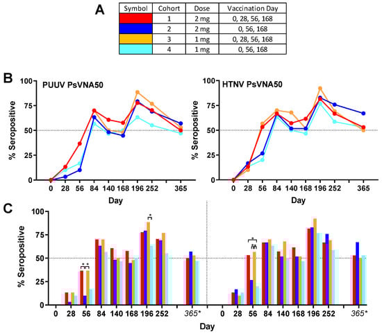 Anti-PUUV and anti-HTNV PsVNA50 seropositivity rates. (A) Legend. (B) PUUV and HTNV seropositivity rates for each cohort presented as line graphs. Percentages are based on the number of subject presenting non-missing data. (C) The same data plotted as bar graphs to highlight significant differences between groups. Percentages are based on the number of subject presenting non-missing data except Day 365. The only subjects who returned for Day 365 were the subpopulation that was still seropositive on the Day 252 visit. For Day 365 the percentage is based on the full cohort size of 30. * p-values from pairwise two-sided Fisher’s exact tests.