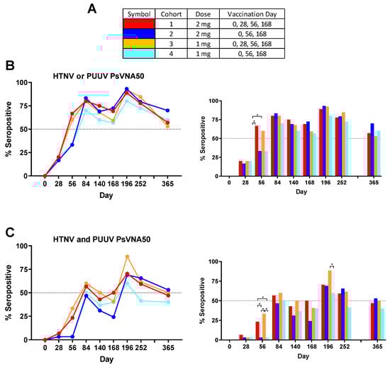 Seropositive to either HTNV or PUUV; or to both viruses. (A) Legend. (B) The percentage of subjects seropositive against either HTNV or PUUV at each timepoint were plotted as line graphs and bar graphs. (C) The percentage of subjects seropositive for both PUUV and HTNV at each timepoint was plotted. Percentages are based on the number of subject presenting non-missing data except day 365. The only subjects who returned for day 365 were the subpopulation that was still seropositive on the day 252 visit. * p-values from pairwise two-sided Fisher’s exact tests.