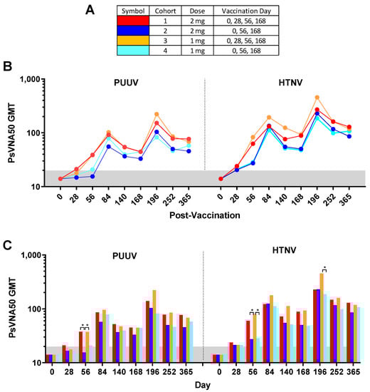 PsVNA geometric mean titers. (A) Legend. The PsVNA50 GMT for PUUV and HTNV presented as line graph (B) or bar graph (C). The limit of quantitation was 20 (grey area). Values <20 were given a value of 14.1. * p-value from post-ANOVA pairwise comparison based on the analysis of log10-transformed titers.