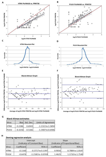 To compare the data obtained by PsVNA with PRNT, the day 84 results of the two assays were analyzed using four different methods: Pearson product moment correlation, mountain plot, Bland–Altman plot and Deming regression analysis. Results from the Pearson product moment correlation of log-transformed HTNV PRNT50 and log-transformed HTNV PsVNA50 showed a strong correlation (r = 0.83, p < 0.01; Figure 7A). Results from the Pearson product moment correlation of log-transformed PUUV PRNT50 and log-transformed PUUV PsVNA50 also showed a moderate correlation (r = 0.70, p < 0.01; Figure 7B). Mountain plots, or folded empirical cumulative distribution plots, are created by computing a percentile for each ranked difference between methods. To get a folded plot, the following transformation was performed for all percentiles above 50 percentile = 100 percentile. These percentiles were then plotted against the differences between the two methods. Symmetrical plots centered over 0 suggest that the two methods were unbiased with respect to each other. Unsymmetrical plots with long tails suggest differences between methods. For HTNV, the mountain plot was centered near zero, but the left tail was larger and longer than the right, suggesting that PRNT50 values were smaller than the respective PsVNA50 values (Figure 7C). For PUUV, the mountain plot was centered near zero, but the right tail was larger and longer than the left, suggesting that PRNT50 values were larger than the respective PsVNA50 values (Figure 7D). Bland–Altman plots show the relationship among the differences between a pair of measurements and the average of a pair of measurements. For each subject, the difference between PRNT50 and PsVNA50 was calculated and the average of the PRNT50 and the PsVNA50 was calculated. These were then plotted against each other. Ideally, 95% of data points fell within 1.96 standard deviations of the mean difference. The data points also should show no discernable pattern of systematic differences. For the HTNV graph, 93.5% of data points fell within 1.96 standard deviations of the mean difference (Figure 7E). For the PUUV graph, 92.7% of data points fell within 1.96 standard deviations of the mean difference (Figure 7F). For both HTNV and PUUV, the Bland–Altman graphs show no discernable systematic differences. Deming regression analysis assesses the presence of a constant bias and proportional bias between two methods using a regression model that adjusts for error on both the x- and y-axes. Constant bias refers to a difference between methods that remains constant over measurement pairs. Proportion bias refers to a difference between methods that varies according to the magnitude of the measurement. The results of the Deming regression model are shown in Figure 7G. If the confidence interval for the intercept contains zero, then it can be concluded that a constant bias does not exist between the two methods. If the confidence interval for the slope contains 1, then it can be concluded that a proportional bias does not exist between the two methods. The model suggests that neither proportional bias nor constant bias exist between assays for HTNV. However, the model also suggests that both proportional bias and constant bias exist between assays for PUUV (i.e., PUUV PRNT50 titers were consistently higher than the respective titers PsVNA50).