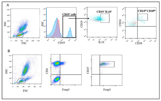 Representative flow cytometry gating strategy to detect Tregs and Bregs. (A) FSC and SSC were used to define the lymphocyte population. CD19+ cells were gated (the blue histogram represents cells stained with anti-CD19 Ab and the red curve represent cells stained with isotype-matched control) and IL-10+ cells were defined. Then cells that are CD24+CD38high were assessed (Breg cells were defined as CD19+IL-10+CD24+hiCD38+hi cells. For the proper gating of the IL-10+ and CD24+hiCD38+hi cells (shown as light blue in the dot blots), fluorescence minus one controls were employed (shown in red color in the dot blots) (B) FSC and SSC were used to define the lymphocytes population followed by gating the CD4+Foxp3+ cells. Then, the CD25+ cells were determined (T regs were defined as CD4+FoxP3+CD25+high cells).
