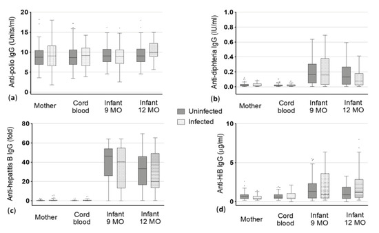 Vaccine-specific immunoglobulin (Ig) G levels to (a) poliomyelitis (polio), (b) diphtheria, (c) hepatitis B and (d) Haemophilus influenzae type B (HiB) antigens in maternal blood and cord blood at delivery and the infants at 9 and 12 months (MO) of age. Dots represent the outliers not removed by ROUT method.