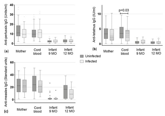 Levels of uninfected mothers and the corresponding cord blood had slightly higher values than infected mothers and corresponding cord blood. Uninfected mothers had a titer of 3.37 Units/mL whereas infected mothers showed a titer of 2.31 (Figure 2, Table 2). A statistically significant lower level of antibodies was found in the cord blood of infants born to infected mothers when compared to those of uninfected mothers (2.38 vs. 3.48 Units/mL, p < 0.03) (Figure 2). The IgG levels against tetanus toxoids declined from infants being nine months old to three months later at 12 months of age (from 0.54 (nine months) to 0.39 Units/mL (12 months) in children of uninfected mothers and from 0.54 (nine months) to 0.47 Units/mL (12 months) in children of infected mothers). However, these changes were not significantly different between children born to uninfected mothers or infected mothers.