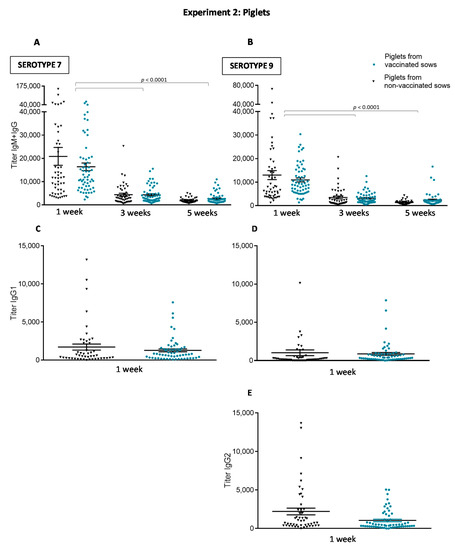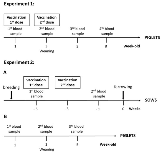 For the second experiment (Figure 1), blood samples were taken from all enrolled sows at 5 weeks (before vaccination) and 1 week (after 2-dose vaccination) pre-farrowing. In total, 120 of the randomly selected and tagged piglets (3 piglets/sow, for a total of 60 piglets/group) from vaccinated and non-vaccinated sows were originally included in the serological study. However, nine piglets from three different non-vaccinated sows could not be identified, resulting in 51 piglets being sampled in this group. Piglets were sampled at approximately 1, 3 and 5 weeks of age.