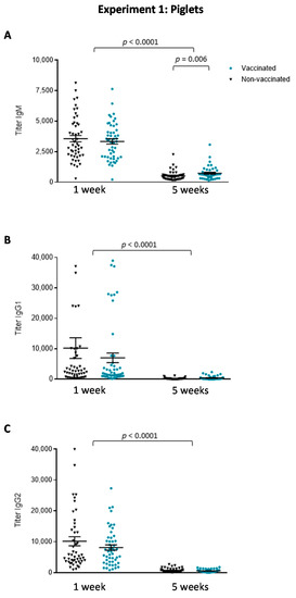 Experiment 1: Isotype profile of antibodies against S. suis serotype 7 in piglets. Blood samples were collected from randomly chosen (and tagged) piglets at one and five weeks of age from 50 vaccinated and 50 non-vaccinated (including the 20 placebos) animals to evaluate: (A) IgM titers; (B) IgG1 titers; and (C) IgG2 titers by ELISA. The vaccination protocol is shown in Figure 1. Antibody titers for individual piglets are shown with horizontal bars representing mean ± SEM. Values significantly different are shown in the graph with corresponding p value.