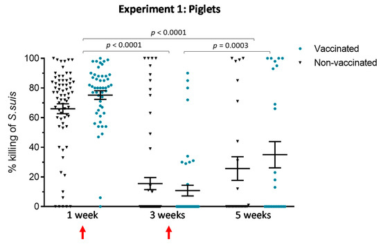 Experiment 1: Opsonophagocytosis killing of S. suis serotype 7 induced by serum antibodies from piglets. Blood samples were collected from randomly chosen piglets at one, three and five weeks of age. Blood samples from 50 vaccinated and 70 non-vaccinated (including the 20 placebos) at one and three weeks of age and from 25 vaccinated and 25 non-vaccinated (including the 20 placebos) at five weeks of age were tested in an opsonophagocytosis assay (OPA) to evaluate their functionality. For OPA, blood leukocytes were mixed with S. suis serotype 7 (vaccine strain) at a multiplicity of infection of 0.01. Control sera or sample sera from vaccinated piglets or non-vaccinated piglets were added to a final concentration of 40% v/v in microtubes which were incubated for 4 h. After incubation, viable bacterial counts were performed and the percentage of bacterial killing was determined. The results are expressed as percent of bacterial killing for individual sera, with horizontal bars representing mean ± SEM. Values significantly different are shown in the graph with corresponding p value. Arrows indicate first and second vaccination doses.