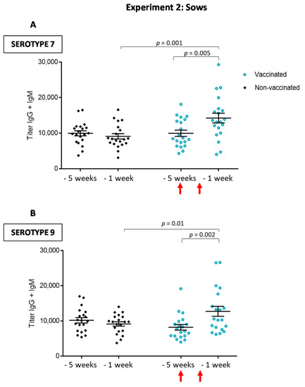 Experiment 2: Total Ig levels against S. suis serotype 7 (A) or serotype 9 (B) in sows. Blood samples were collected one and five weeks before farrowing from 20 vaccinated and 20 non-vaccinated sows to follow the immune response. The vaccine was administered at five and three weeks before farrowing. Total Ig [IgG + IgM] titers were determined by ELISA. Antibody titers for individual sows are shown with horizontal bars representing mean ± SEM. Values significantly different are shown in the graph with corresponding p value. Arrows indicate first and second vaccination doses.