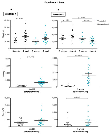Experiment 2: Isotype profile of antibodies against S. suis serotype 7 (A) or serotype 9 (B) in sows. Blood samples were collected one and five weeks before farrowing from 20 vaccinated and 20 non-vaccinated sows to follow the immune response. The vaccination protocol is shown in Figure 1. IgM, IgG1 and IgG2 titers were determined by ELISA. Antibody titers for individual sows are shown with horizontal bars representing mean ± SEM. Values significantly different are shown in the graph with corresponding p value.