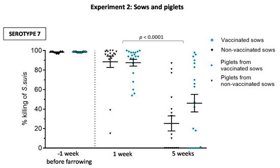 Experiment 2: Opsonophagocytosis killing of S. suis serotype 7 induced by serum antibodies from sows and from their piglets. Blood samples were collected one week before farrowing from seven vaccinated and seven non-vaccinated sows and from randomly chosen piglets (1 per sow) at one and five weeks of age (n = 20 per group) to evaluate their functionality in an opsonophagocytosis assay (OPA). For OPA, blood leukocytes were mixed with S. suis serotype 7 (vaccine strain) at a multiplicity of infection of 0.01. Control sera or sample sera from vaccinated or non-vaccinated animals were added to a final concentration of 40% v/v in microtubes, which were incubated for 4 h. After incubation, viable bacterial counts were performed and the percentage of bacterial killing determined. The results are expressed as percent of bacterial killing for individual sera, with horizontal bars representing mean ± SEM. Values significantly different are shown in the graph with corresponding p value.
