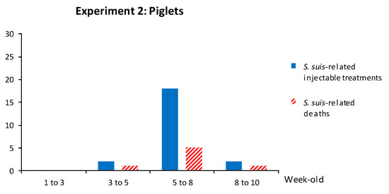 In total, 207 piglets from vaccinated sows and 183 piglets from non-vaccinated sows were followed for clinical outcomes and injectable treatments were recorded. The mortality rate related to S. suis disease was 3.3%: 3.4% in the vaccinated group and 3.3% in the non-vaccinated group (Table 3). Mortality and clinical signs related to S. suis were similar to those described above. The kinetics of S. suis-related mortality and S. suis-related injectable treatments (such as penicillin G) showed that clinical disease peaked at five weeks of age (Figure 10). When bacterial isolation and serotyping were possible, either serotype 7 or serotype 9 (n = 6) was found in brain and/or joint swabs of clinically affected animals.