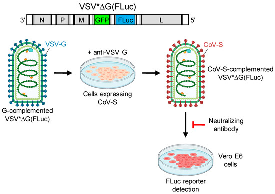 - Fukushi, S.; Mizutani, T.; Saijo, M.; Matsuyama, S.; Miyajima, N.; Taguchi, F.; Itamura, S.; Kurane, I.; Morikawa, S. Vesicular stomatitis virus pseudotyped with severe acute respiratory syndrome coronavirus spike protein. J. Gen. Virol. 2005, 86, 2269–2274. [Google Scholar] [CrossRef]