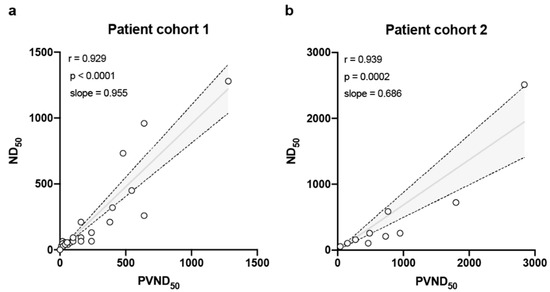 | Patient No. | Age (y) | Patient Status | Disease Severity | Virus Detection (RT-PCR) | IgG Ratio | IgA Ratio | ND50 a | PVND50 b | ||