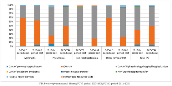 The use of major health resources increased during the second study period, resulting in increased mean costs in general, as well as for meningitis, pneumonia, and non-focal bacteremia. Comparison of the two study periods showed that the factors that increased the most in the second period were the days of ICU admission and urgent health transfers, indicating that the severity of IPD, and therefore the costs, increased during the second study period. In addition, while the overall costs of IPD decreased between the first and second periods due to the reduction in the number of cases, the cases that occurred in the second period were more severe, consumed more health resources, and had a 31.4% higher mean cost. Although some authors had already warned of a possible increase in the severity of IPD after the introduction of PCV [37], to the best of our knowledge, this is the first study in which this increase in severity has been quantified and reflected as an increase in costs.