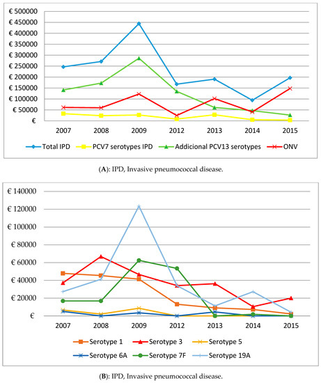 (A) Annual evolution of costs associated with IPD according to PCV serotypes; and (B) Annual evolution of costs associated with IPD according to PCV serotype.