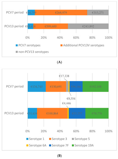 (A) Variation in the proportion of IPD costs according with PCV serotypes in the two study periods; and (B) variation in the proportion of IPD costs according with additional PCV13 serotypes in the two study periods.