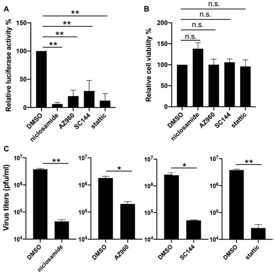 Inhibition of VACV by STAT3 inhibitors. (A) Normal human dermal fibroblast (NHDF) cells were treated with DMSO, niclosamide (1 µM), AZ960 (3 µM), SC144 (1 µM), or static (3 µM), and then they were infected with vLGluc at 1 PFU/cell. At 8 h later, luciferase activity was determined in collected cell culture media. (B) NHDF cells were treated with the above drugs for 24 h and cell viability was measured by an MTT (3-(4,5-dimethylthiazol-2-yl)-2,5 diphenyl tetrazolium bromide) assay. Three biological replicates were carried out. Error bars indicated standard deviation. (C) NHDF cells were treated with selected STAT3 inhibitors at the concentrations mentioned above and infected with VACV-WR at 0.01 PFU/cell. Viruses were collected at 48 hpi and tittered in BS-C-1 cells. Error bars indicate standard deviation (n = 3). Statistics: * p < 0.05, ** p < 0.01, n.s.: non-significant by two-sided Students’ T test.
