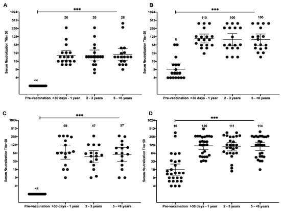 Data analysis was conducted in GraphPad Prism version 8.1.1. Group geometric mean titer (GMT) of pre-immunization and each timeframes post-immunization were determined utilizing the NT50 calculated by nonlinear regression; subjects without a detectable NAb titer (NT50 < 4) are represented as NT50 2. GMTs were then compared by an ANOVA with Tukey’s multiple comparisons test when appropriate and p < 0.05 required for significance.