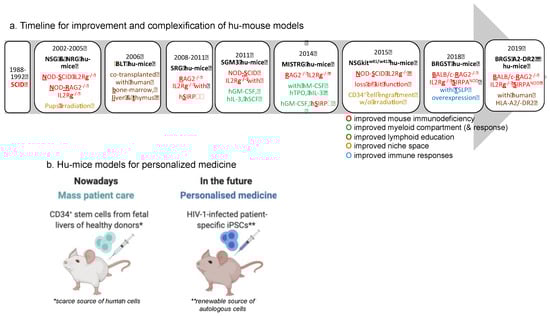 - Marsden, M.D.; Zack, J.A. Humanized mouse models for human immunodeficiency virus infection. Annu. Rev. Virol. 2017, 4, 393–412. [Google Scholar] [CrossRef]