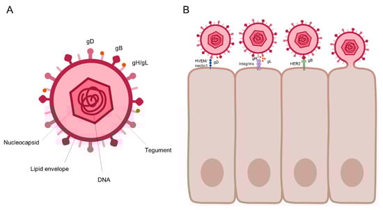 The structure of HSV and its entry (A) HSV virus structure. HSV has several glycoproteins in its lipid envelope, including glycoproteins, gD, gB, and gH/gL, which are known to function in cell entry. gB and gD are the most targeted molecules in the development of a vaccine against genital herpes. gB is targeted for CD4 T cell activation and gD is targeted for CD8 T cell activation. (B) HSV cell entry. First, gD binds to HVEM/nectin1, and this binding signals gL dissociation from gH. The gH-integrin interaction then leads to gB-HER2 binding. These serial binding interactions lead to HSV entry into the host cell. Images are created with BioRender.com.