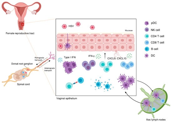Anti-HSV immune response When HSV enters the female human body, epithelial cells recognize HSV in a PRR-dependent or PRR-independent manner. Then, pDC, NK cells, and DCs are recruited to vaginal tissue. Type I IFN, which is released from pDCs, suppresses viral replication. DCs process viral antigen, migrate to draining lymph nodes, and prime T cells. CD4 T cells appear first and induce the release of chemoattractants CXCL9 and CXCL10 via release of IFN-γ for CD8 T cell recruitment. CD4 T cells also assist B cells to generate antibody against HSV. CD8 T cells kill infected cells and control HSV reactivation. CD4 T cells orchestrate the primary response and CD8 T cells respond quickly to viral replication and reduce genital recurrence. Images are created with BioRender.com.