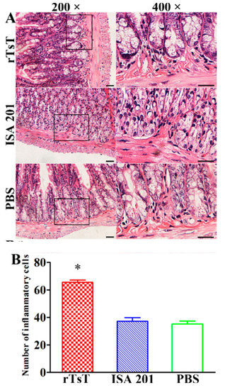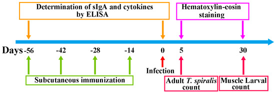 To detect secretory IgA (sIgA) in enteral secretion, enteral secretions were collected as described [8,59]. In brief, a 20 cm length of complete small intestine (duodenum, jejunum and ileum) was excised and cut into three enteral segment. Cold PBS with 1% protease inhibitor (Sangon Biotech, Shanghai, China) was flushed through the intestine. The washing fluid was harvested. The sample was pooled and centrifuged at 5000× g at 4 °C for 5 min, and the supernatant was recovered [29]. Total enteral sIgA was measured with a sandwich ELISA [57]. TsT-specific sIgA was detected using ELISA with 2 μg/mL muscle larval crude antigens or rTsT as described [30]. The plate was colored using OPD and the optical density (OD) at 492 nm was measured with an ELISA reader as described before [60].