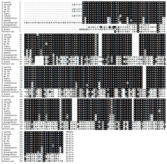Sequence alignment of Trichinella spiralis trypsin gene (GenBank: XP_003374437.1) with other Trichinella species/genotypes and Trichuris suis. The sequences of trypsin from various organisms were analyzed using Clustal W, the obvious difference was found in diverse Trichinella species or genotypes. Black shade represents the same residues with TsT, and grey shade indicates the conservative substitutions.