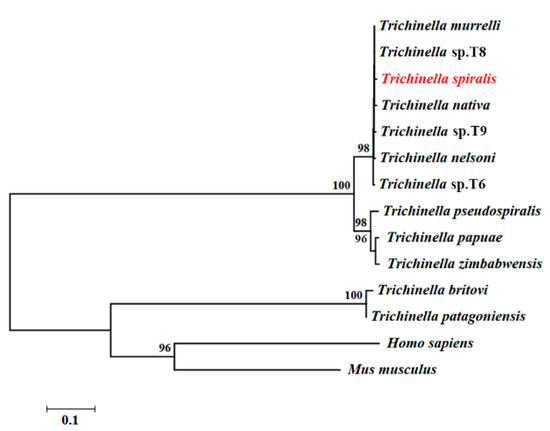 - Wang, Z.Q.; Li, L.Z.; Jiang, P.; Liu, L.N.; Cui, J. Molecular identification and phylogenetic analysis of Trichinella isolates from different provinces in mainland China. Parasitol. Res. 2012, 110, 753–757. [Google Scholar] [CrossRef]