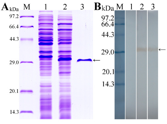 Expression and identification of recombinant TsT protein. (A): Expression and purification of rTsT. SDS-PAGE analysis showing rTsT was expressed in IPTG-induced E. coli lysates (lane 2), but not expressed in E. coli lysate prior to induction (lane 1). Lane 3: the purified rTsT protein. (B): Western blot analysis of the rTsT immunoreaction. Lane 1: un-induced E. coli lysate was not recognized by anti-his McAb. Specific recognition of expressed rTsT in induced E. coli lysate (Lane 2) and purified rTsT by anti-his McAb. Arrow shows the rTsT.