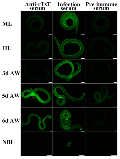 Fresh complete worms of various T. spiralis stages (ML, IIL, AW and NBL) were fixed in cold acetone for 20 min. Furthermore, the ML, IIL and AW were embedded in paraffin, 3-µm thick cross-sections were prepared using a microtome. Expression and tissue localization of native TsT in various T. spiralis stages were determine with IIFT [16,56]. In brief, the whole worms and worm cross-sections were blocked using 1% BSA in PBS and then incubated with various sera (1:10; anti-rTsT serum, infection serum or pre-immune serum) at 37 °C for 2 h. Following washes with PBS, worms and cross-sections were stained with anti-mouse IgG conjugated FITC (1:100; Santa Cruz Biotech, Dallas, Texas, USA). After washes again, the whole worms and cross-sections were examined under a fluorescence microscopy (Olympus, Tokyo, Japan) [57,58].